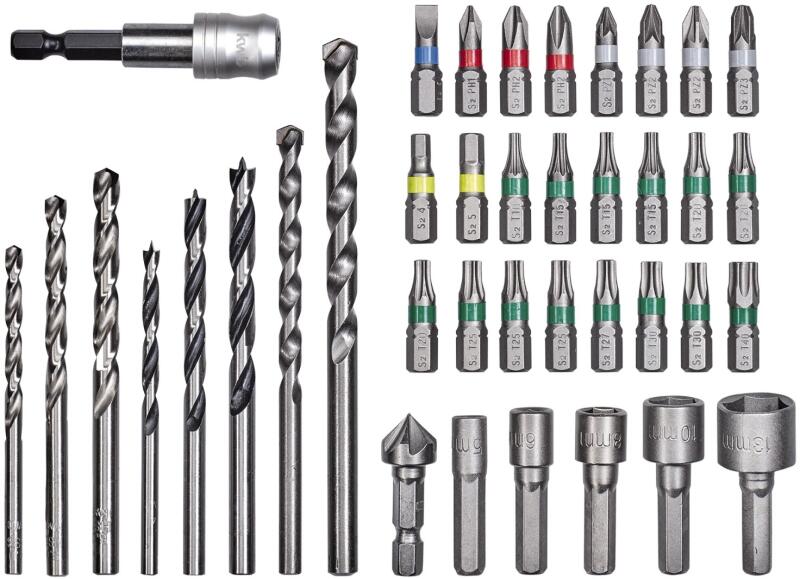 A 39 részes Einhell bit- és fúrószárkészlet praktikus tartozék minden 6,35 mm-es (1/4"), hatszögű befogóval rendelkező fúró-csavarozóhoz. A készlet 24 darab 25 mm hosszúságú és leginkább szokásos formájú bitet, 3 darab HSS fémfúrót, 3 darab fafúrót, 2 darab keményfém kőfúrót, 5 darab dugókulcsbetétet, egy süllyesztőt és egy gyorscserélő bittartót tartalmaz. A tartozékkészlet praktikus dobozban kapható. A csomag az alábbi biteket és fúrószárakat tartalmazza: Bit-kivitelek: 5 mm: PH1, PH2, PZ1, PZ2 és PZ3, Hex 4,5 mm, TX10, 15, 20, 25, 27, 30 és 40, a különösen fontos formák részben többször elhelyezve, a bitek anyaga CR-V, minden bit C6.3-as szárral, 4 mm, 5 mm és 6 mm átmérőjű, 118°-os hegyű HSS fémfúrók E6.3-as szárral, 6 mm és 8 mm átmérőjű kőfúrók keményfém heggyel és E6.3-as szárral, 4,5 mm és 6 mm átmérőjű fafúrók 3-pontos csiszolással és E6.3-as szárral, dugókulcsbetétek anyák becsavarásához, süllyesztő a csavarok egy síkban történő süllyesztéséhez. A bitek és fúrószárak a kereskedelemben szokásos valamennyi fúrógéphez és akkus csavarozóhoz alkalmasak.