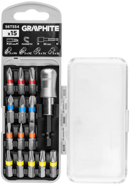 GRAPHITE Csavarhúzó bitkészlet 25mm, mágneses szárral, műanyag tokban, 15db (56T554)