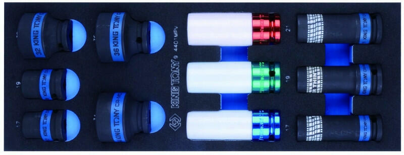 KING TONY 1/2" gépi dugókulcs készlet 11 részes 9-4401MPV. Tartalma: 4415M: 17, 19, 21mm; 4535M: 17, 19, 32, 34, 36mm; 4945MX 17, 19, 21mm Tálcaméret #10 (140 x 375mm)