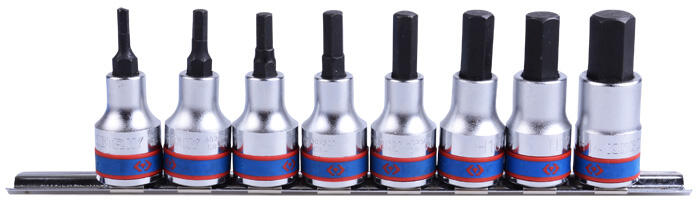King Tony 3108PR8 imbusz bitdugófej készlet sínen, rövid imbuszkulcsfej változat, hatlapfejű. Metrikus méret DIN 7422.