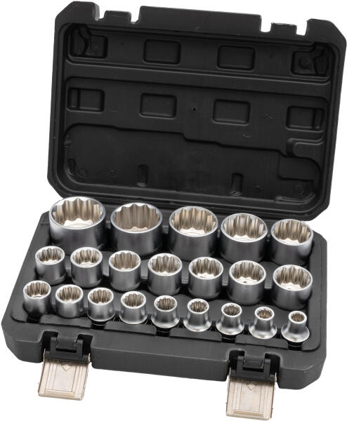 Leírás Alkalmas metrikus és hüvelykes (SAE) szabványos 6 pontos Torx és 12 pontos csavarokhoz. Króm-vanádium acél 50BV30 kovácsolás a tartósság érdekében. 1/2"-es négyzet alakú meghajtás. Praktikus kofferban kapható. Tartalom 1/2"-es, négyzet alakú, 12 pontos dugókulcsok a következő méretekkel: 8, 9, 10, 11, 12, 13, 14, 15, 16, 17, 18, 19, 20, 21, 22, 24, 27, 30, 32, 34, 36mm