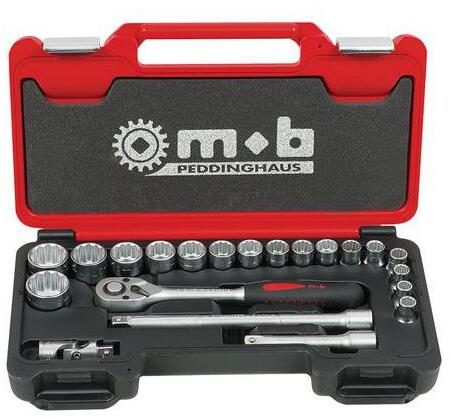 17 fej: 8/10/11/12/13/14/15/16/17/18/19/21/22/24 /27/30/32 mm. A készlet 1 db racsnis csuklót és 1 db univerzális csuklót tartalmaz. 2 hosszabbítás: 125 és 250 mm.