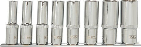 Spline ½ feltét, hosszú, 8 db-os készlet, szferikus, illeszkedik úgy a colos, mint a metrikus hatlapú, tizenkétlapú, négylapú, Torx és Spline csavarfejekre, CrV acél, méretek: 10 mm, 12 mm, 13 mm, 15 mm, 17 mm, 19 mm, 22 mm, 24 mm