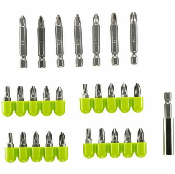 • 20x 25 mm-es csavarhúzó bit - 4x Philips (PH2), 12x Pozidrive (8xPZ2, 4xPZ3), 4x Torx (TX20), 1x 60 mm-es bittartó