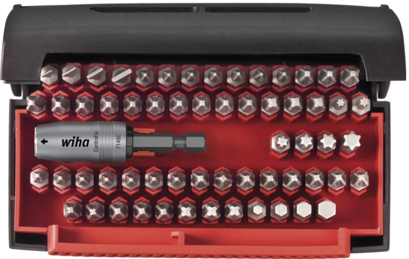 Ház Nagyszilárdságú műanyagból készült robosztus doboz. A doboz gombnyomásra automatikusan nyílik. Markolat Wiha SoftFinish® többkomponensű markolat, mágneses, 1/4" bitbefogóval. Alkalmazás Markolattal és bittartóval azonnal használható akár gépi, akár kézi működtetéshez. Bittartók CentroFix Force gyorskioldó bit befogó, mágneses. A készletben: 1x Standard 25-ös bit sorozat Lapos 1/4" C6,3 4.5 mm (01623) 1x Standard 25-ös bit sorozat Lapos 1/4" C6,3 5.5 mm (01624) 1x Standard 25-ös bit sorozat Lapos 1/4" C6,3 6.5 mm (01626) 1x Standard 25-ös bit sorozat lapos 8,0 mm 7x Standard 25-ös bit sorozat Phillips 1/4" C6,3 PH1 (01657) 13x Standard 25-ös bit sorozat Phillips 1/4" C6,3 PH2 (01658) 3x Standard 25-ös bit sorozat Phillips 1/4" C6,3 PH3 (01659) 7x Standard 25-ös bit sorozat Pozidriv 1/4" C6,3 PZ1 (01688) 13x Standard 25-ös bit sorozat Pozidriv 1/4" C6,3 PZ2 (01689) 3x Standard 25-ös bit sorozat Pozidriv 1/4" C6,3 PZ3 (01690) 1x Standard 25-ös bit sorozat TORX® 1/4" C6,3 T10 (01716) 1x Standard 25-ös bit sorozat TORX® 1/4" C6,3 T15 (01717) 1x Standard 25-ös bit sorozat TORX® 1/4" C6,3 T20 (01718) 1x Standard 25-ös bit sorozat TORX® 1/4" C6,3 T25 (01719) 1x Standard 25-ös bit sorozat TORX® 1/4" C6,3 T30 (01721) 1x Standard 25-ös bit sorozat TORX® 1/4" C6,3 T40 (01722) 1x Standard 25-ös bit sorozat Imbusz 1/4" C6,3 3.0 mm (01705) 1x Standard 25-ös bit sorozat Imbusz 1/4" C6,3 4.0 mm (01706) 1x Standard 25-ös bit sorozat Imbusz 1/4" C6,3 5.0 mm (01707) 1x Standard 25-ös bit sorozat Imbusz 1/4" C6,3 6.0 mm (01708) 1x CentroFix Force mechanikusan reteszelhető bittartó 1/4" mágneses, dobozban 60 mm (39133) 1x Collector Box